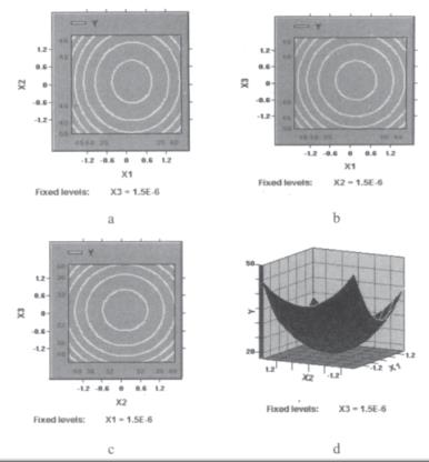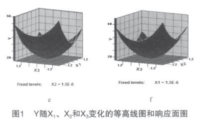 利用響應(yīng)面分析法[1]化枸杞子渣超微粉碎工藝參數(shù)。在單因素預(yù)試驗(yàn)基礎(chǔ)上,用SAS軟件系統(tǒng)進(jìn)行響應(yīng)面分析,設(shè)計(jì)一個(gè)三因素五水平的回歸方程來擬合因素和指標(biāo)(響應(yīng)值)之間的函數(shù)關(guān)系。選擇球料比(X1)、枸杞子渣漿液濃度(X2)和攪拌器轉(zhuǎn)速(X3)作為因素,以粉碎后的顆粒粒度d50作為響應(yīng)值對(duì)球磨機(jī)濕法超微粉碎工藝進(jìn)行化。